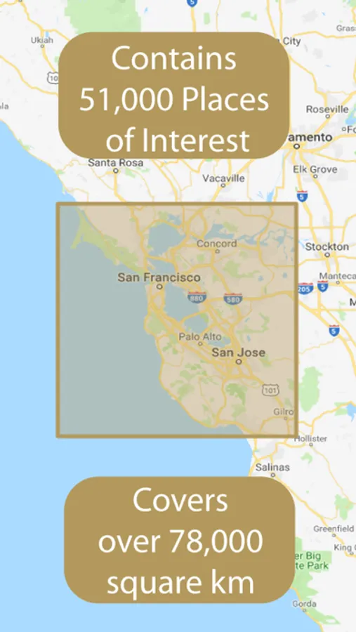 This version, for San Francisco, locates places in and around San Francisco's City Centre and the much wider San Francisco and Bay Area. The area covered encompasses a rectangle stretching west from the coast past Point Reyes and Vellejo in the north to south past Santa Cruz and east to Gilroy and Morgan Hill. This is an area of 21,840 sq miles (56,000 km2).