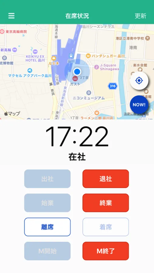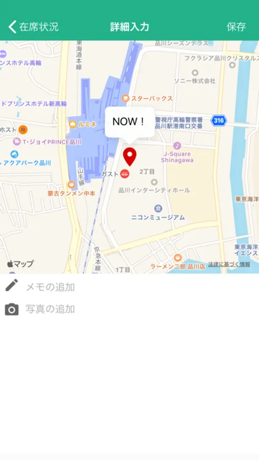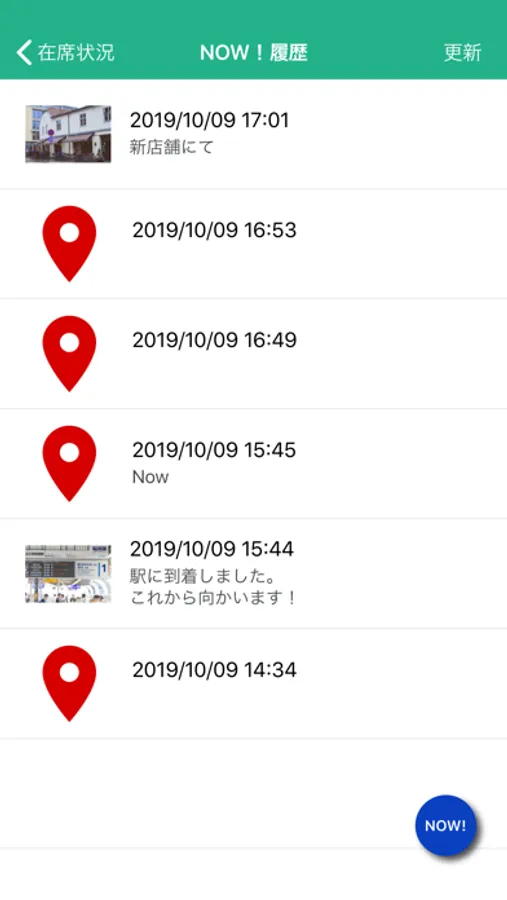 アプリ上の「NOW!」ボタンをタップすると、「NI Collabo 360」の行先伝言共有機能と連携し、現在地を記録・確認できるほか、メモや写真もアップロードできます。
