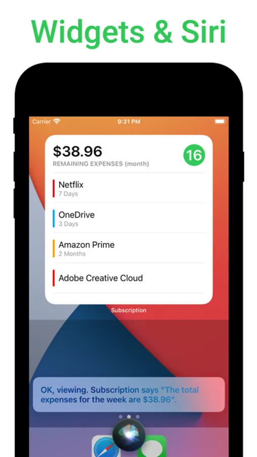 View your subscriptions and expenses right on your home screen or just ask Siri about your remaining expenses and more!