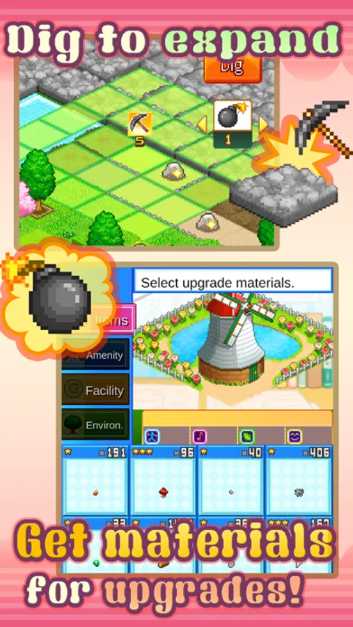When you start running out of space, grab a pickaxe and make more land usable, also finding various materials in the process. These materials can be used to upgrade your facilities, or even make special items!