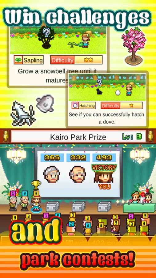 Build plazas, playgrounds, animal petting zones, food courts and more! Design your park as you like. There are all sorts of facilities for you to construct. And of course, good management is key to ensuring the park prospers, bringing in lots of visitors.