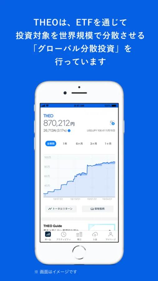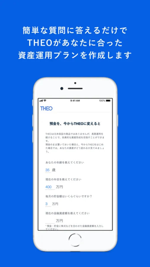 THEO のコンセプトは、「プロとAIがいる、おまかせ資産運用。」 毎日を全力で生きるすべての人たちをサポートする、AI搭載ロボアドバイザーによる投資一任運用サービスです。年齢や現在の金融資産額などの情報から、ロボアドバイザーが、一人ひとりに合った、最大30種類以上のETFからなるポートフォリオを提案します。お申し込みはスマホだけで完了し、運用報酬も最大1.10%(税込・年率)と低コストではじめられる、新しい資産運用のカタチです。