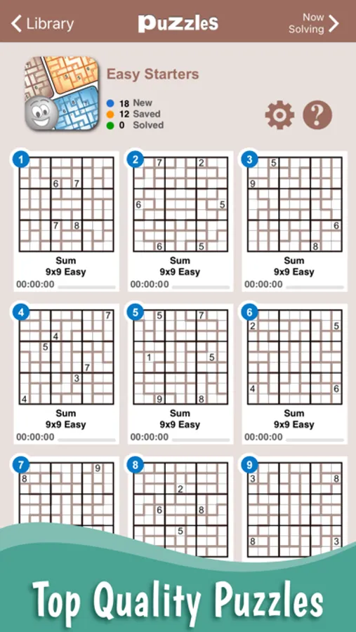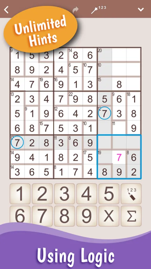 The game includes helpful features such as showing possible sum number combinations in an area and pencilmarks to make temporary placement of numbers in the grid. To help see the puzzle progress, graphic previews in the puzzle list show the progress of all puzzles in a volume as they are being solved. A Gallery view option provides these previews in a larger format.
