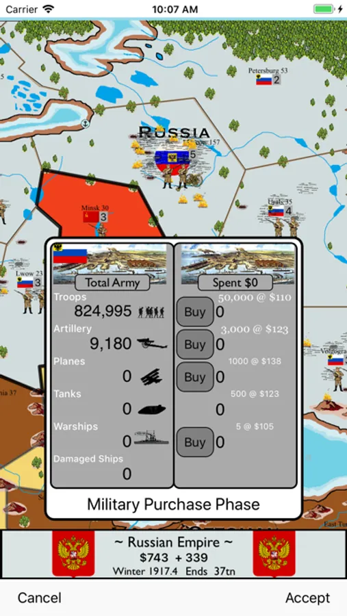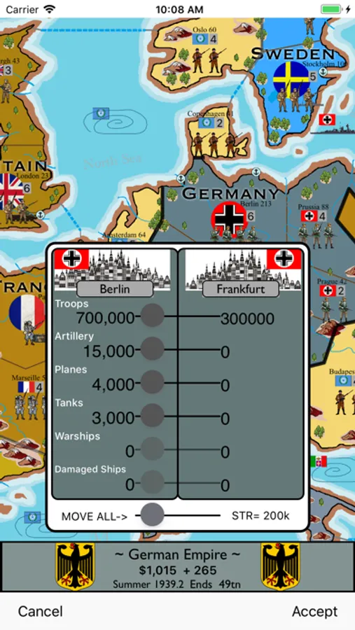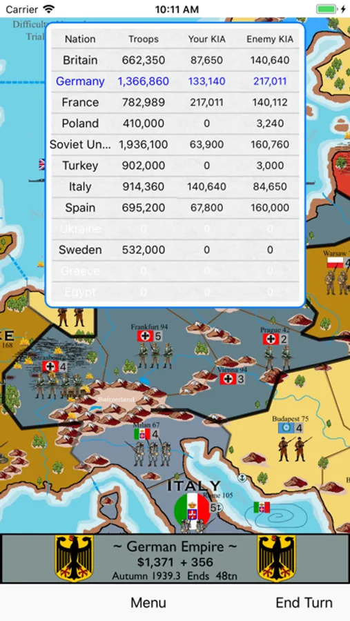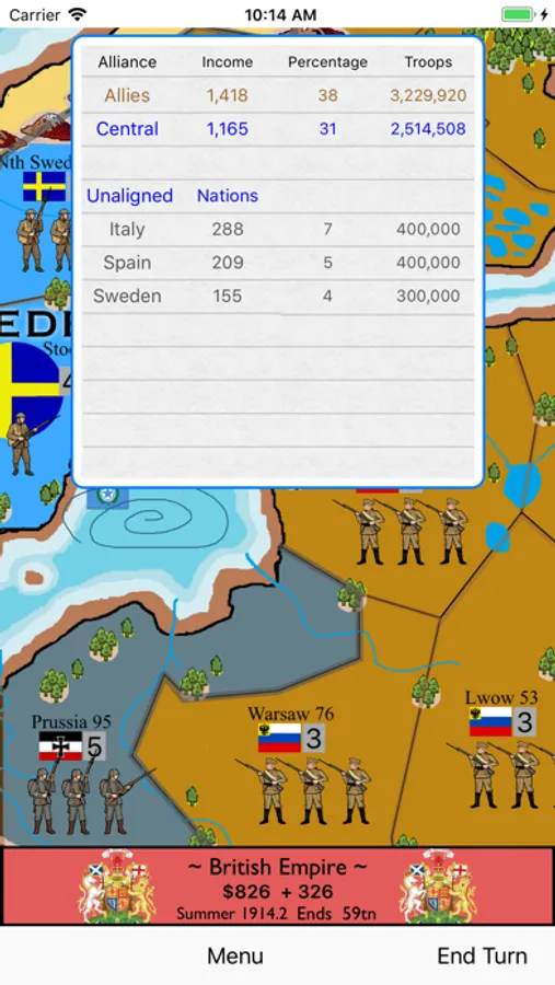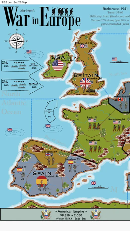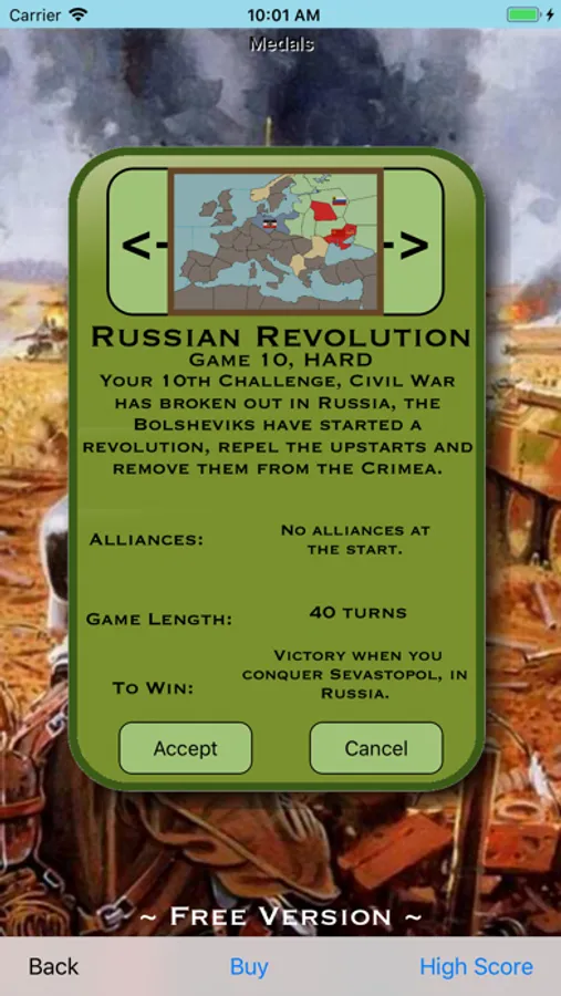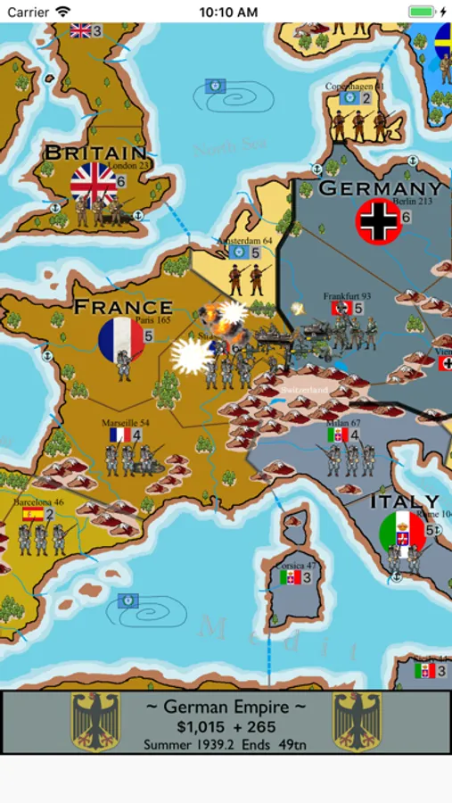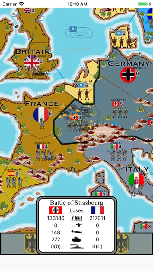 War in Europe is a fast turn-based land grabbing war game that is easy to learn but requires some planning and strategy to master. With the use of thousands of troops, planes, artillery, tanks, and warships you must defend your lands while conquering your enemy’s lands. Build up your fortifications while your artillery bombards your enemies, make alliances with other nations and control the sea areas with your navy. Victory will go to the one who can control enough land zones to fulfill the victory conditions. The game is ad free, and each game can be completed within one hour. Scenarios includes WW1, WW2, and a Free-For-All, the free version offers 12 small scenarios.