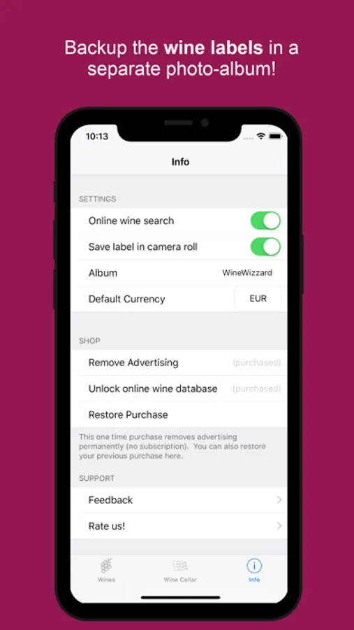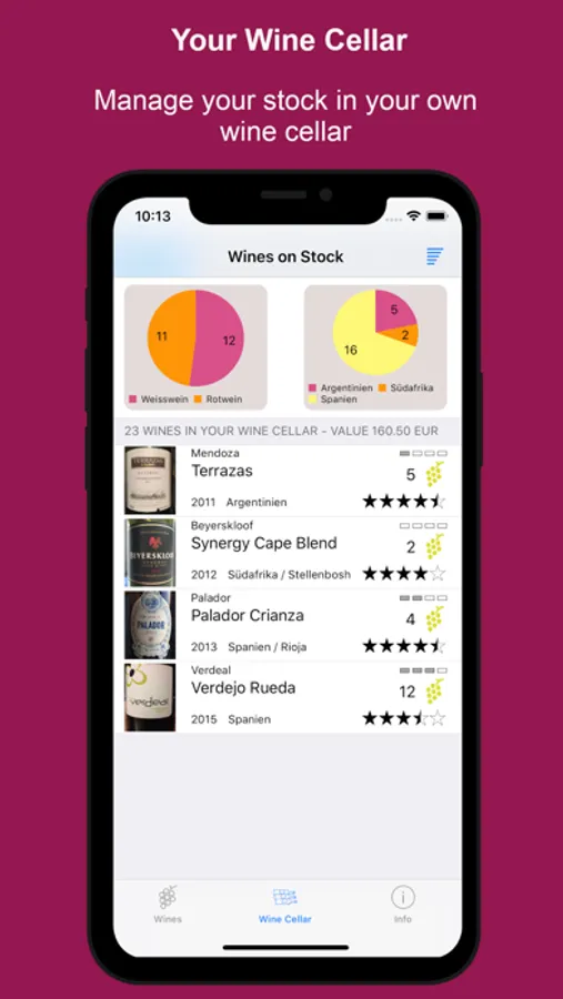 WineWizzard will help you to keep track of your tasted wines and the stock of your own wine cellar.