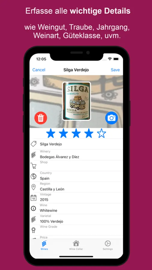 - add various details to your wines (name, wine-type, grape, vinery, country/region, vintage, grade, prize, currency, alcohol, notes)