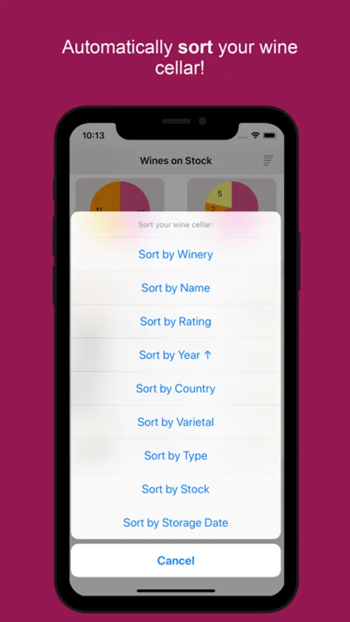 - the wine cellar can be sorted by various criteria (vinery, name, vintage, country, etc.)
