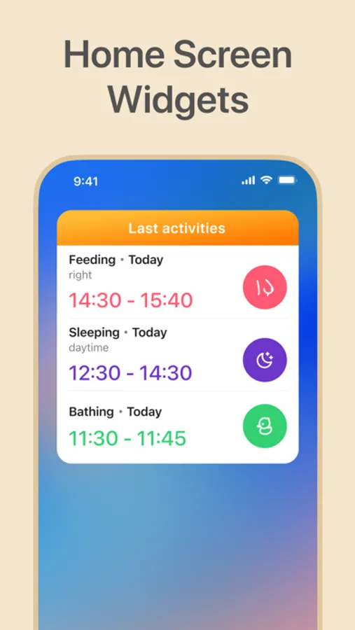 Just click the appropriate button at the beginning of the feeding or other activities. Your baby care history will be reliably stored. All this info may be useful when you visit the pediatrician, as well as for the further development of your child.