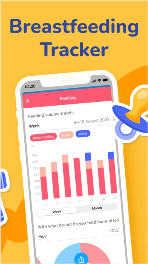 Just click the appropriate button at the beginning of the feeding and other activities. Your baby care history will be reliably stored. All this information may be useful when you visit the pediatrician, as well as for the further development of your child.