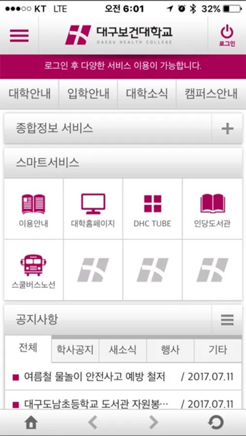 대구보건대학교 Smart DHC App은 학교 주요 정보 뿐만 아니라 구성원들이 이용할 수 있는 다양한 서비스를 제공하는 모바일 서비스입니다