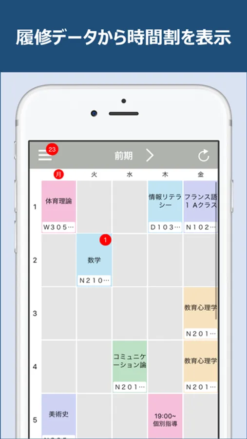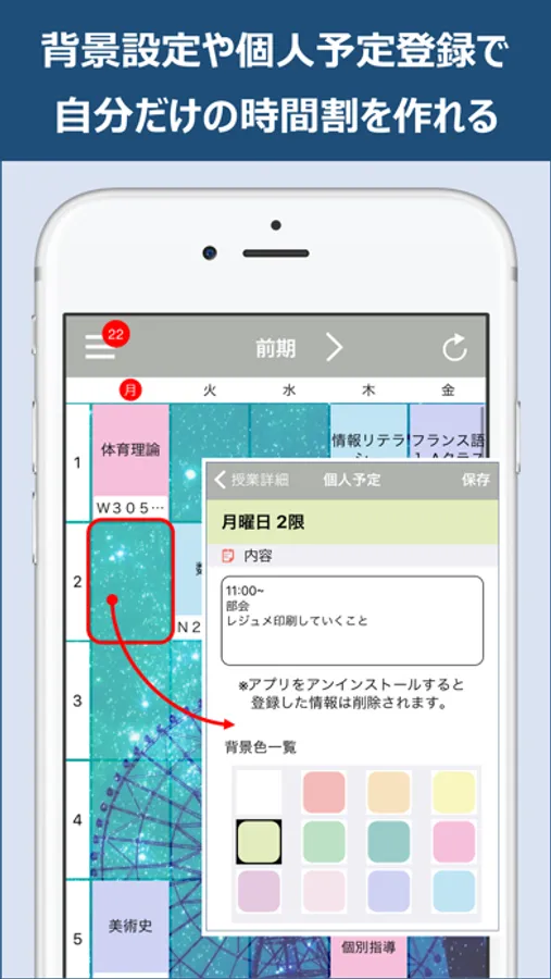 設定機能で0時限目を表示すれば、朝練など授業前の予定も登録可能です。
