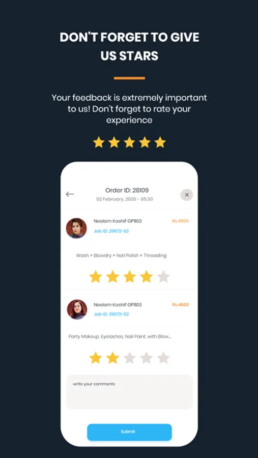 - Once your service is done, you will rate your experience!