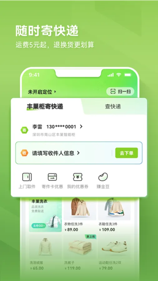 - 24h寄件:多快递比价,运费5元起!手机下单,随时去丰巢柜寄快递不用等;支持快递员上门取件,足不出户更轻松!