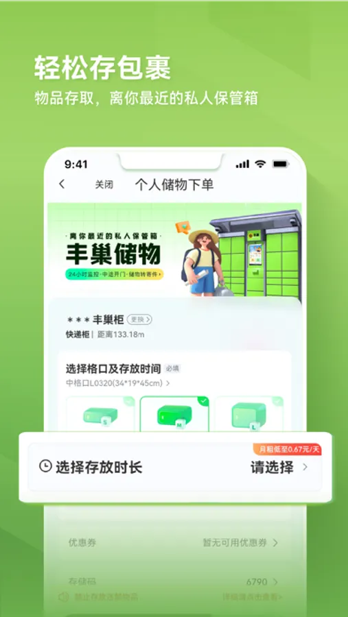 - 便捷储物:物品暂存,随存随取,1小时起存,支持临时存放/长期存放两种模式。