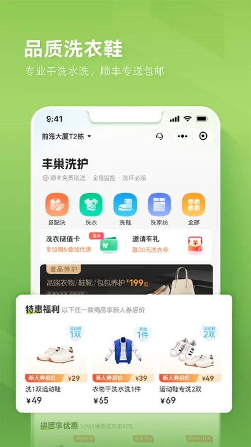 - 丰巢洗护:品质洗衣洗鞋,顺丰专送包邮,提供专业干洗水洗服务、定制化洗护方案。