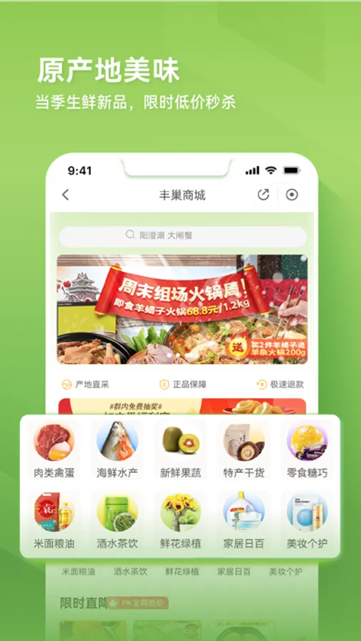 - 丰巢商城:产地直采生鲜好物平台,“严选好物、严控品质、安全检测”为品牌保障,为消费者提供全球高品质生鲜商品。