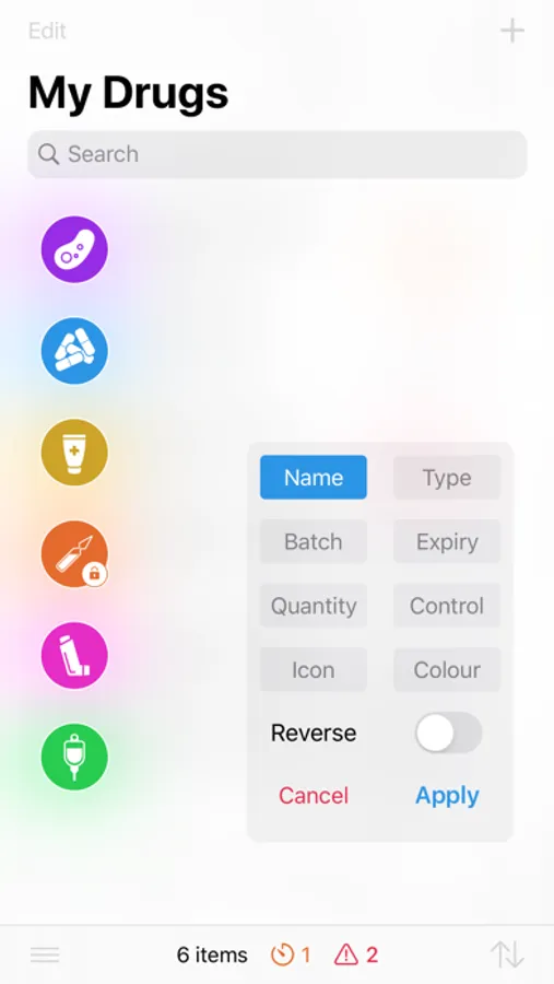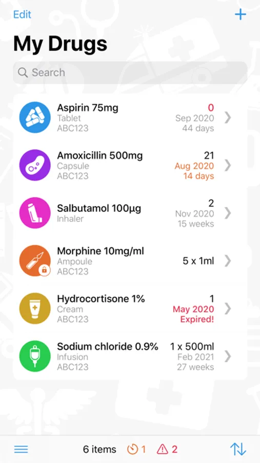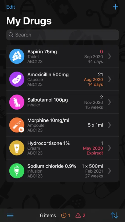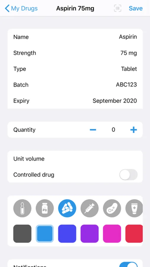• Customise the icons, colours, notes and other information for each item. You can even add your own drug types and strength units.