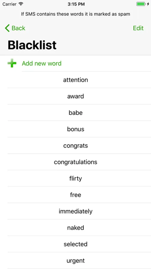 SMS filter comes with a pre-built list of common words in spam message in the English language. You may edit this list, add your own words or remove words, and you can add words in any language. SMS filter also contains a list of words in Hebrew if your device contains that language.