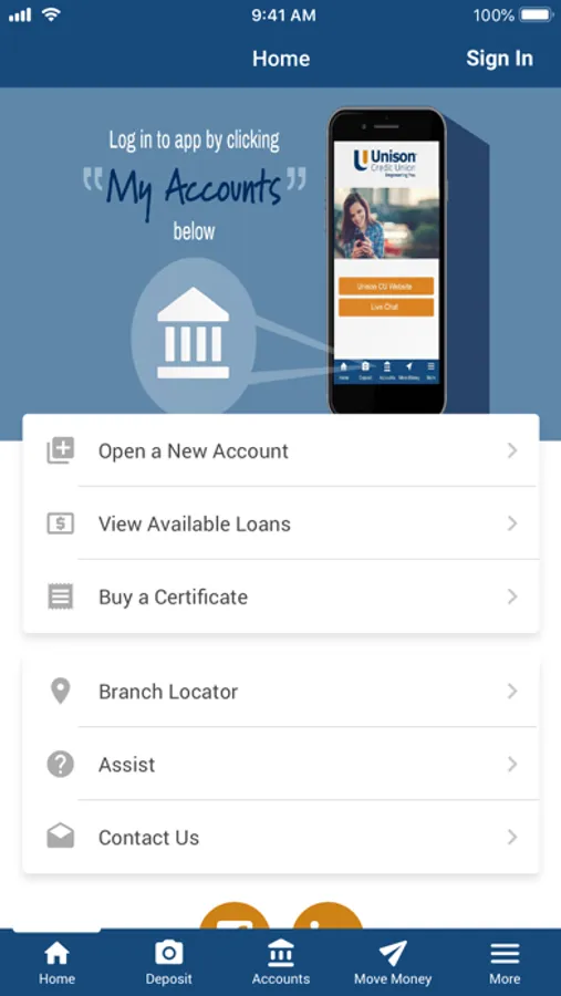 Unison Credit Union Mobile provides members convenient access to our website, mobile check deposit, mobile banking, branch and contact information.