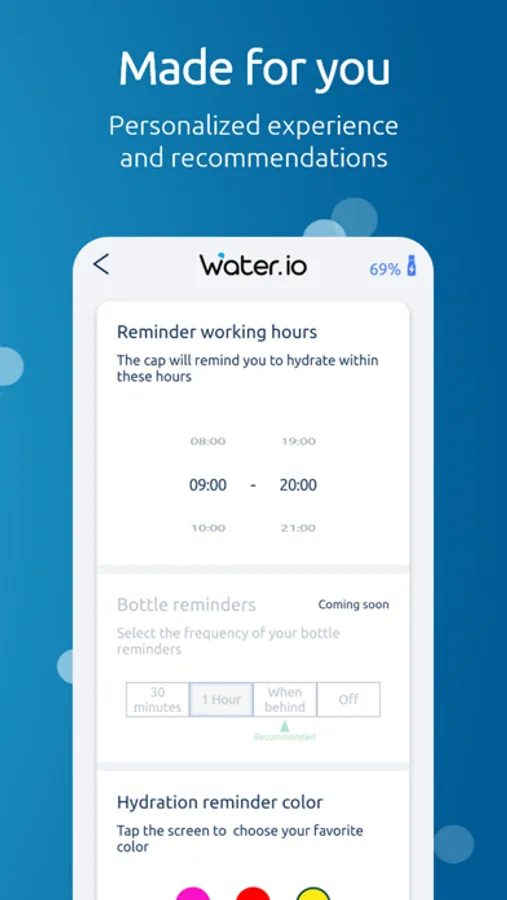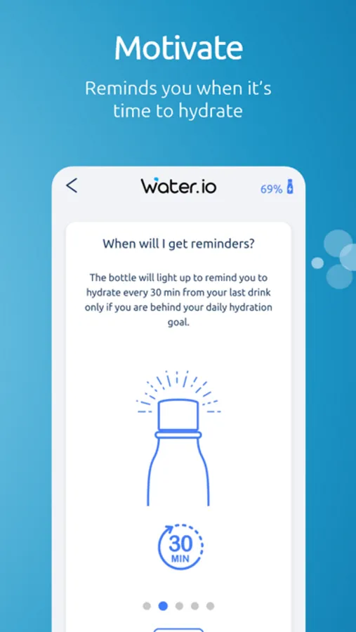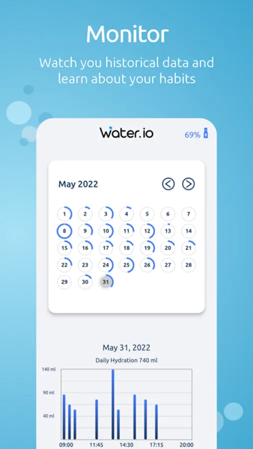Using the Water.io Smart Bottle we track and monitor the user's hydration through the day, we remind the user when it's time to hydrate and making sure they never forget!