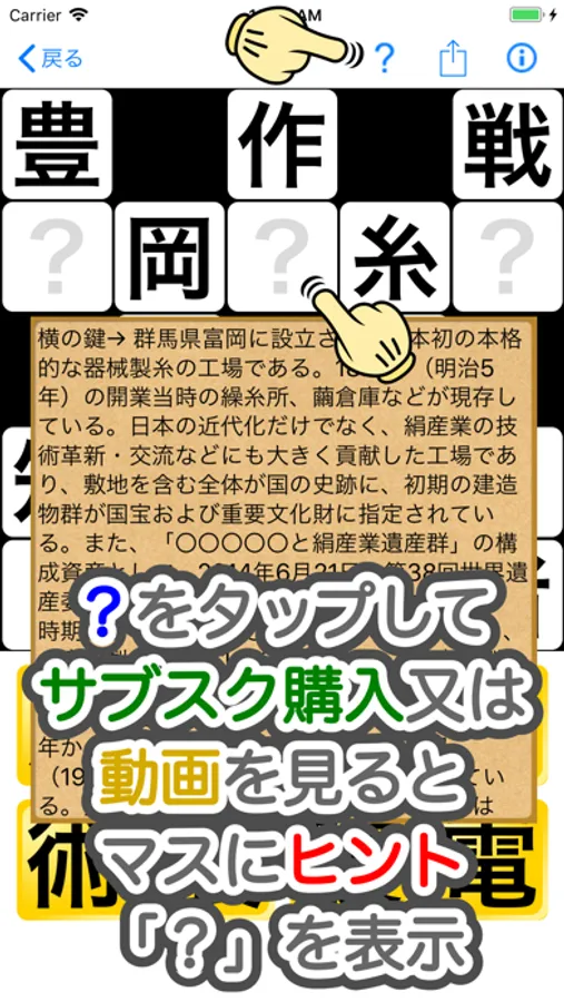 また、?をタップしてサブスク購入又は動画を視聴すると言葉のヒントを表示します。