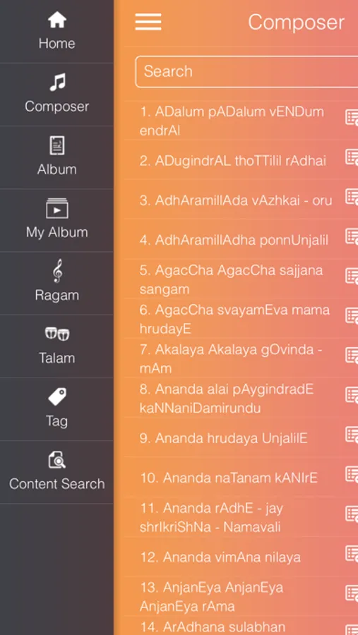 * Search can be done by Composer, Ragam, Talam, Tag or Song content.