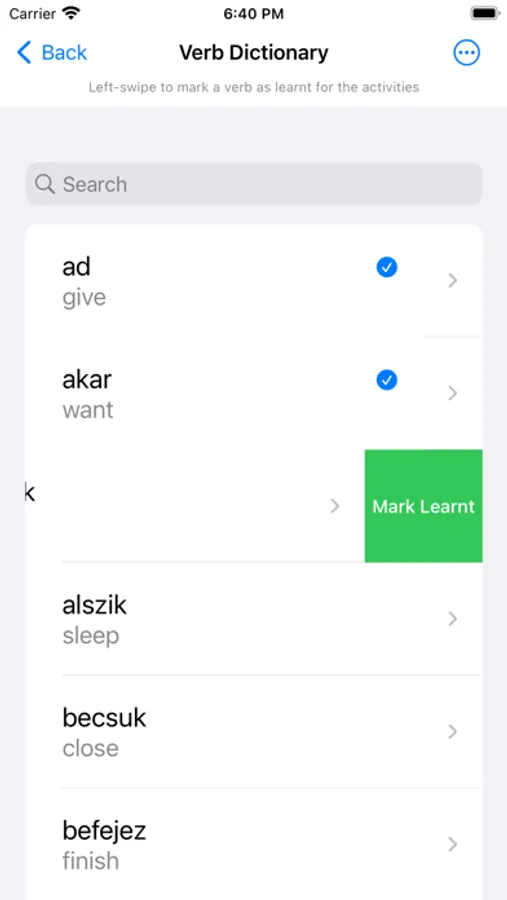 You can test yourself on the whole set of verbs, or mark verbs in the reference list as 'learnt' by swiping left on list entries to build up a 'personal bank' of learnt words.