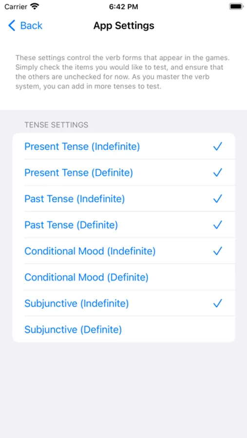 In the settings, you can select which tenses to drill in the games, as well as choose whether to drill indefinite or definite forms. So whether you're a beginner, or already on the way to mastery, there's a level for you!