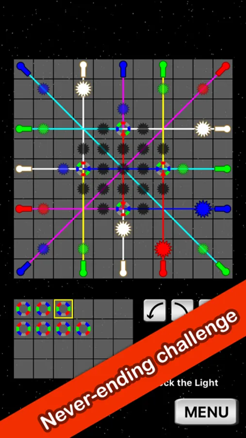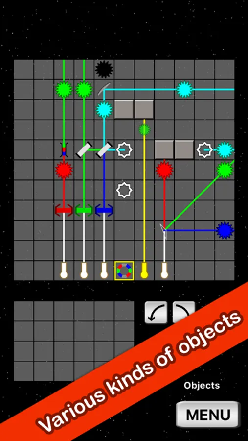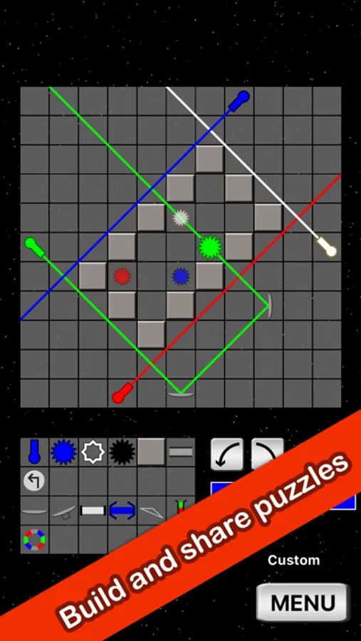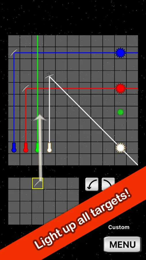 Bend the Light is a puzzle game of lasers and mirrors. Your goal is to build constructions that deflect beams so they hit desingated targets. It offers levels ranging from easy distractions to hard challenges.