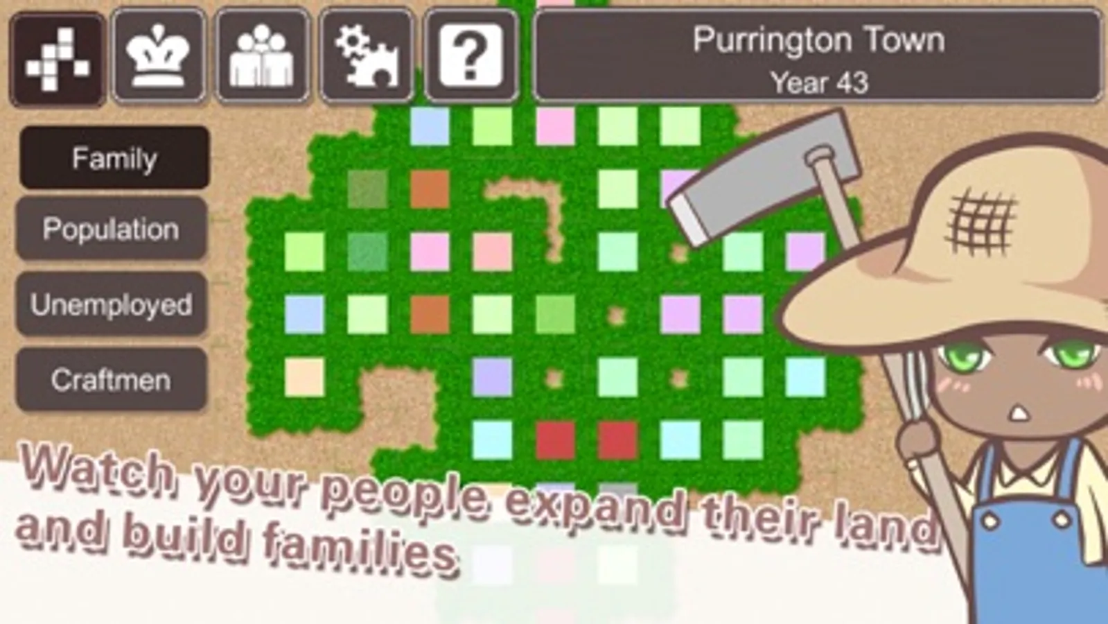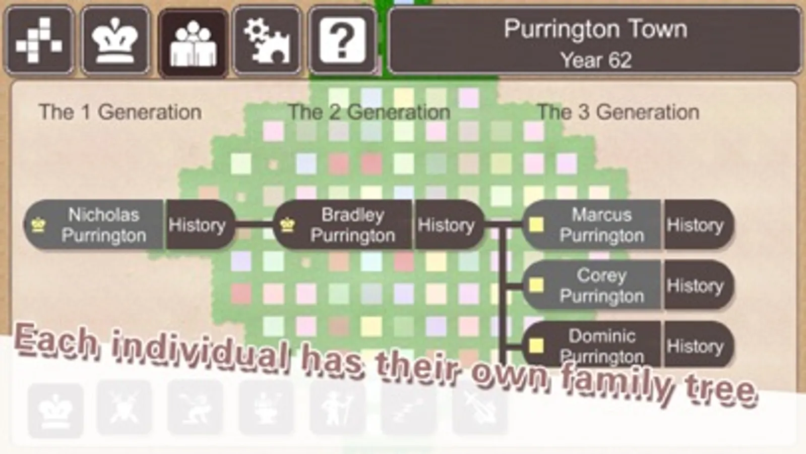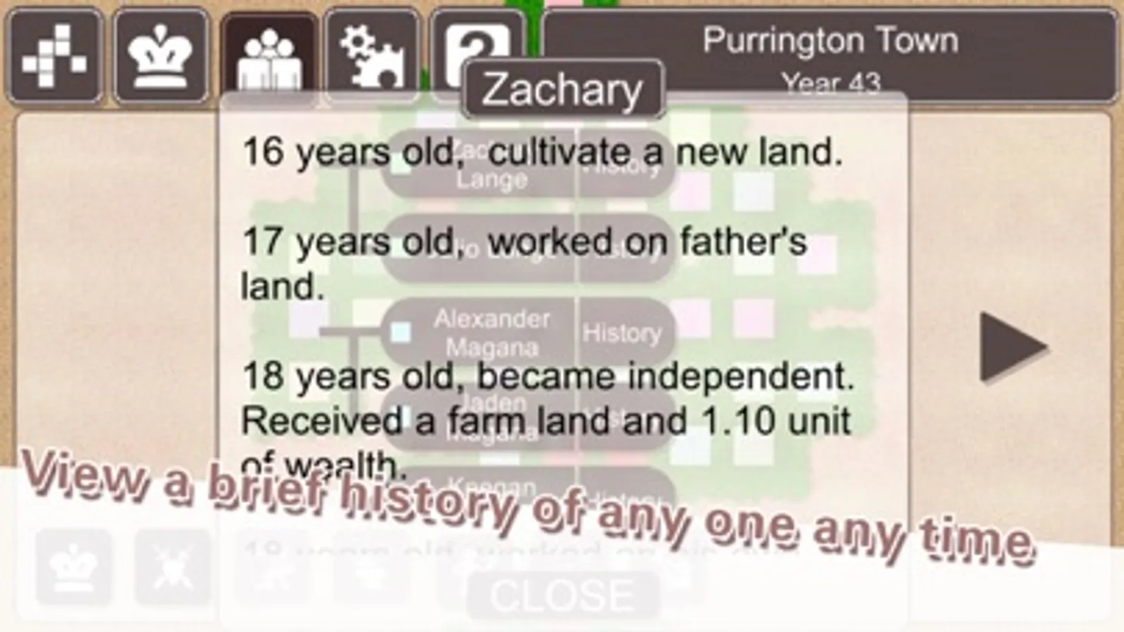 At any time, you can pause your game and view the life of any person. You can see how your tax policies and decisions affect their lives. Here are some examples: Tom was a farmer who had a little land and saving. After you ordered him working on infrastructures for several years, he might run out of saving, had to sell his farm and work on other's farms. Joe was a young adult who just got independent. His father did not give him any farm. Joe could not find a job or a land to cultivate. But because your tax is low, everyone around him had some extra money to spend. Joe might decide to spend a few years learning craftsmanship as an apprentice. After he graduated, Joe served his community with his skills and lived a wealthy life. Jimmy bought and cultivated a lot of farms when you had a low farm tax. When you increased the farm tax later, he could not afford the tax and chose to sell them at a much lower price to his neighbors.