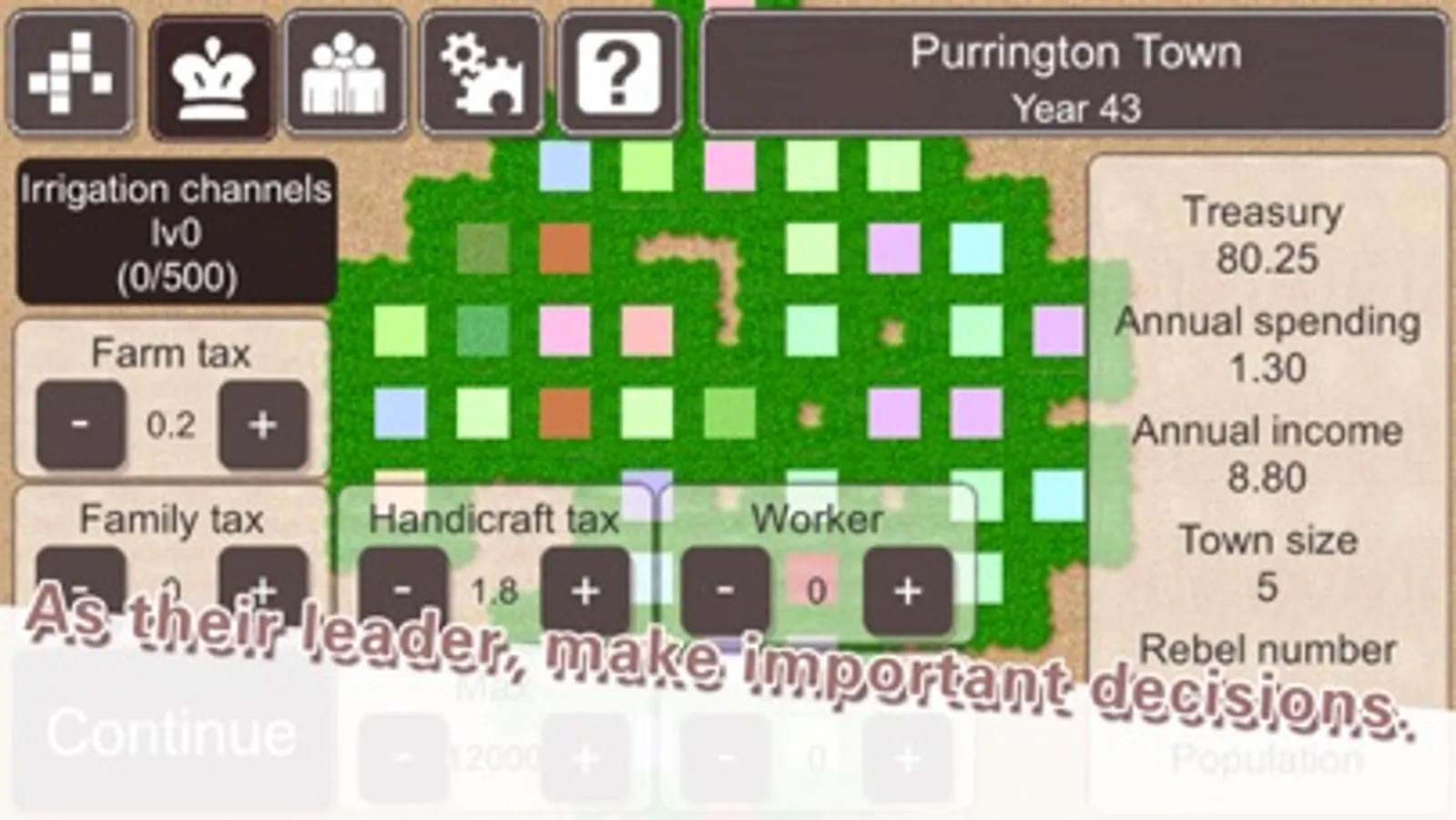 The game will be over if all your people died, your goverment run out of money, or the leader died without an heir. You have to start a new game when the game is over. You can try carefully adjusting your tax, keep everything in balance, and build a kingdom that last thousands of years. Or you can be creative with your policies, do all kinds of experiments on this simulated land. The decision is yours.
