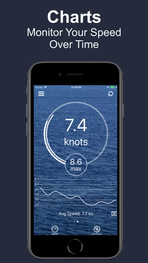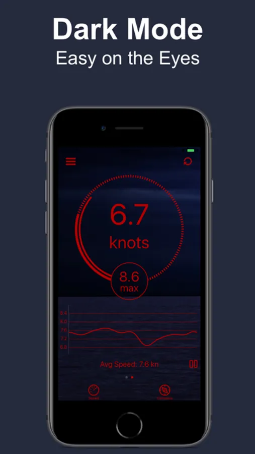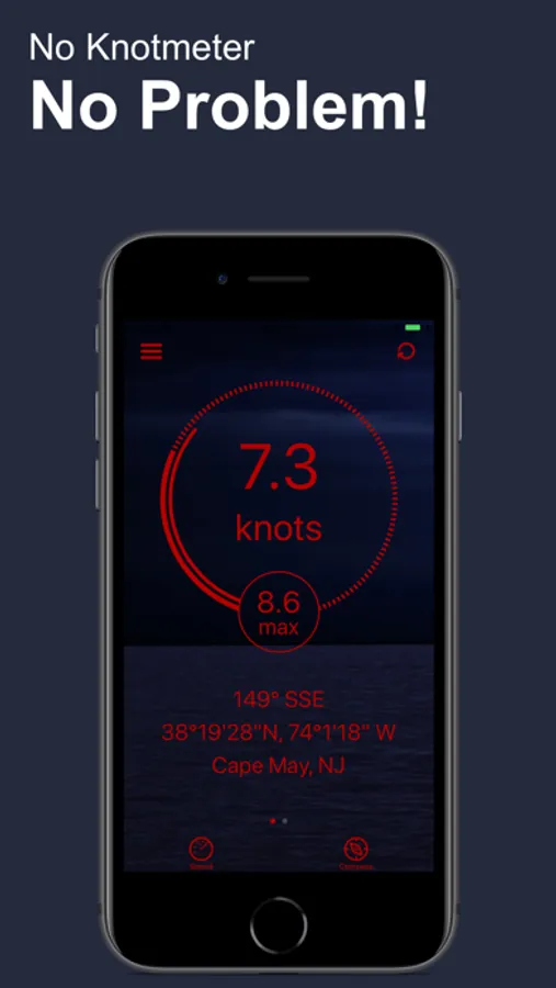 BoatSpeed includes a Knotmeter to monitor your speed throughout your voyage. The speed reported by your device's GPS is shown on the gauge. For the best results, use BoatSpeed outside with a clear view of the sky.