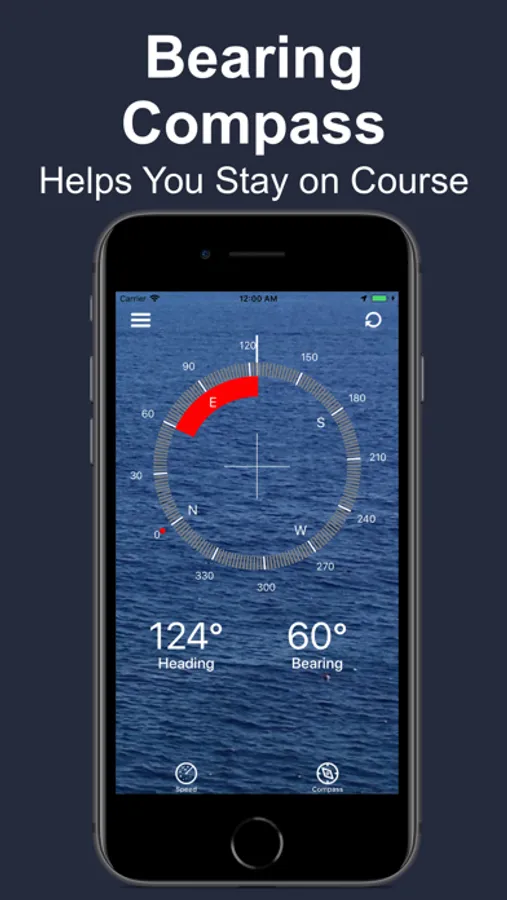 BoatSpeed features a bearing compass to help you stay on course. As you move, the deviation from your bearing will be shown in red. Use the speed and compass buttons to quickly switch modes.