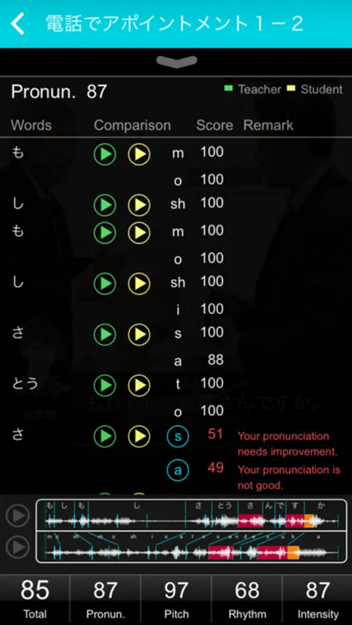 MyJT is like a personal tutor that can help you learn Japanese and English through speaking practice. MyJT's unique and award-winning technology, "Automatic Speech Analysis System" (ASAS©), can analyze your speech on pronunciation, pitch, timing and emphasis, and even pinpoint problems to individual sounds. After you speak, you receive a score and specific feedback on how to improve. Whether you're a beginner or advanced learner, MyJT is like a one-on-one tutor who can make speaking a comfortable experience!
