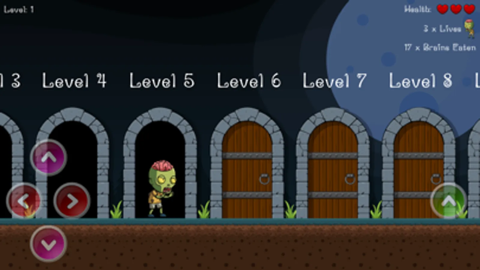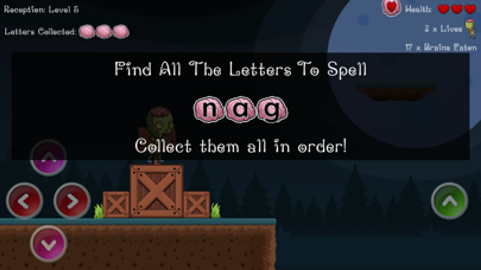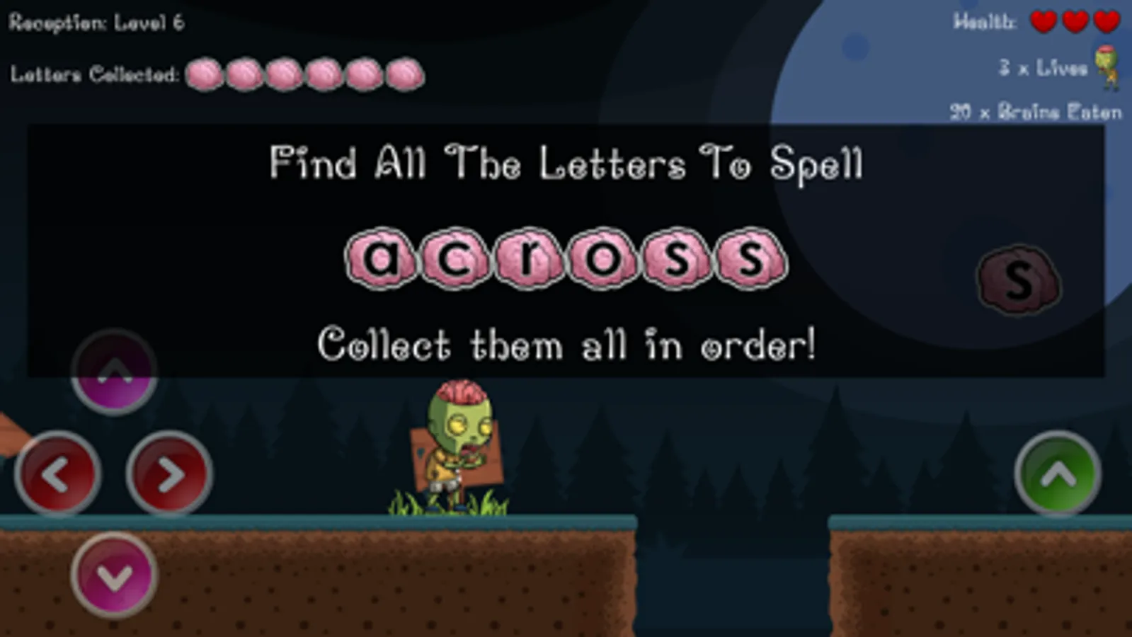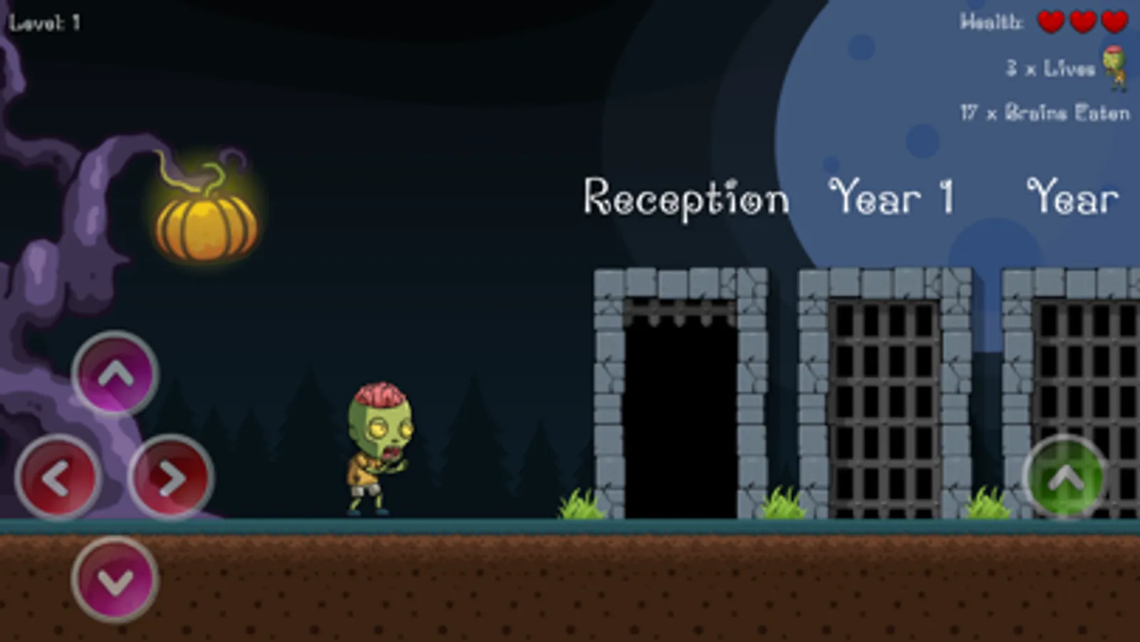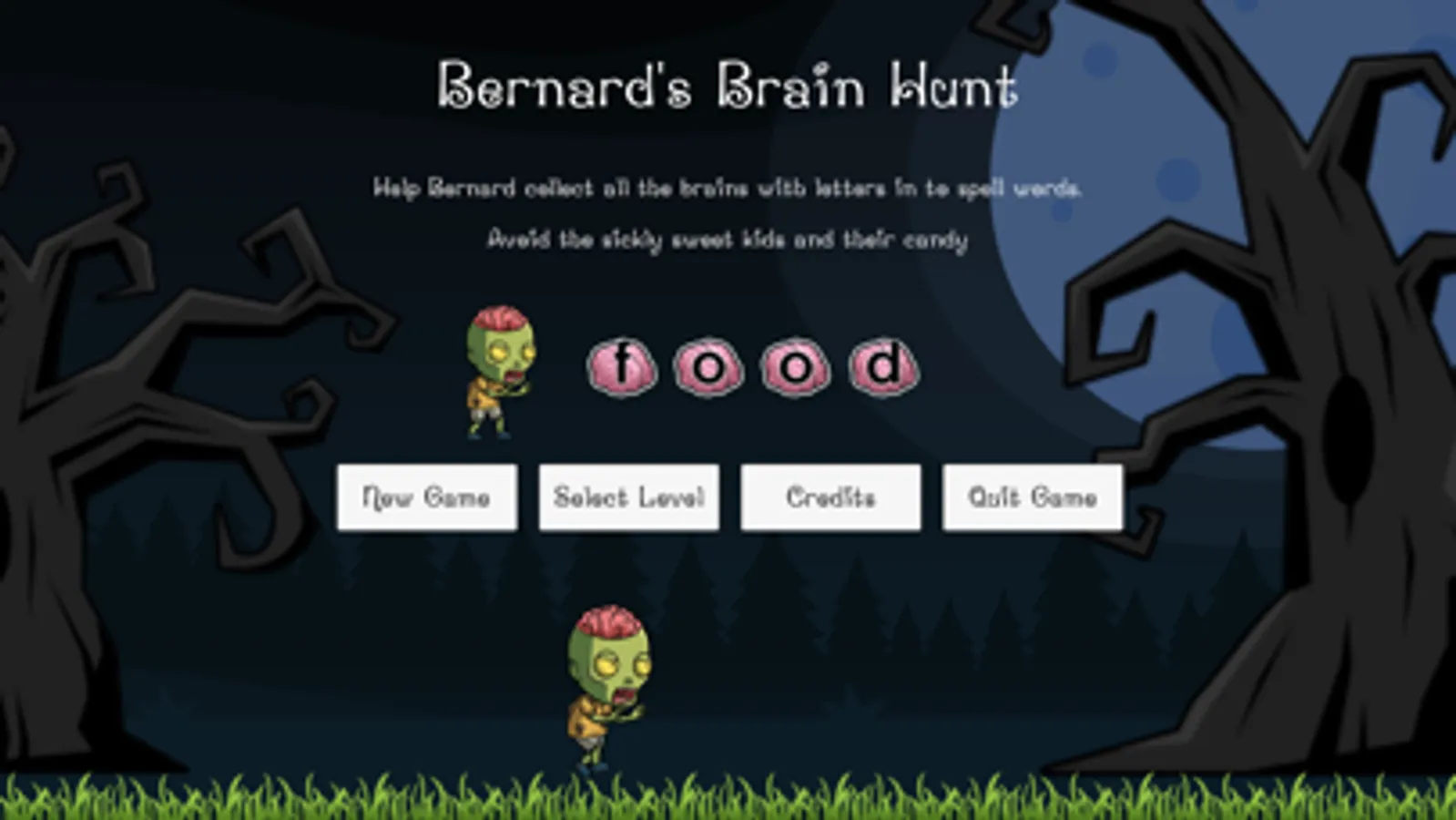 Mild mannered Bernard, English teacher extraordinaire, was zombified in a horrible incident involving a military experiment, An incident so top secret not even Bernard knows what happened. All we can tell you is Bernard's desire to eat brains is only matched by his compulsion to carry on making sure spelling lessons continue. Avoid the sickly sweet children as they will suck the life out of Bernard, avoid the hazards in the form of spinning candy and spikes as they will hurt. Look for the brains with the letters on them...be sure to collect them in the right order so that Bernard can spell the words out properly.