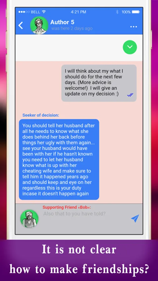 Friend is a social app that helps to improve your friend skills and to learn how to give a support to people in difficult situations. You do not need to register. All you have to do - write to people and try to help by your POWER of WORDS.