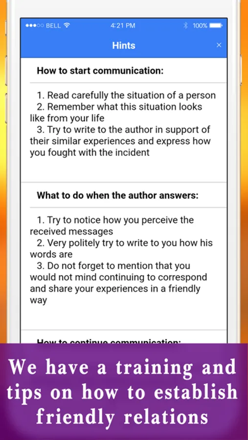 There are many betrayals, lies and deceit around us. We sometimes do not notice how to gradually step over the line ... But for long-term relationships you need trust and a willingness to take risks in front of another person. It is not easy. But this can be learned. To begin with, you need to learn how to understand the interlocutor yourself, and for this, in the first place, listen carefully and remember how it was at home. After that, dare and tell your story of the experience. And be ready to accept the reaction and response of the other. And only so continue to communicate. This requires a lot of courage, social skills and patience. It is in our application that you can try to give support and learn how to build friendly communication that will help you in your personal life and not only.