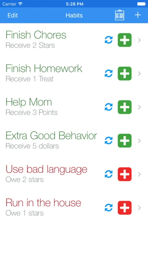 - Automatically calculate the number of rewards & punishments based how many times the kid performs the good or bad behavior