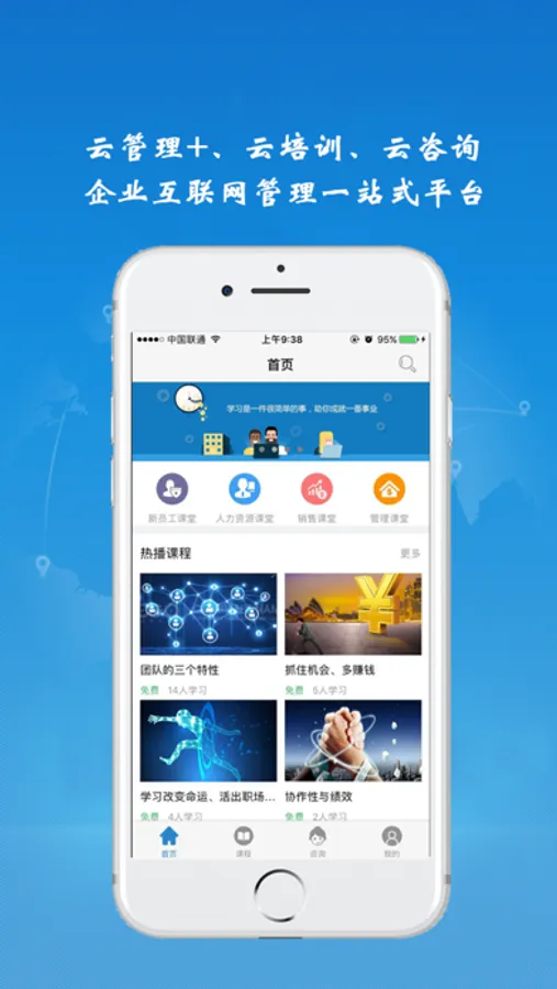 才智云课堂一款基于sass应用平台的管理系统,包括云办公、云人力资源、云培训、云咨询,为企业提供全新的互联网管理平台,帮助企业提高团队执行力,完善人企业人力资源管理。同时科学、高端的培训课程和专家咨询团队,为企业搭建管理、成长、学习、孵化及咨询服务的综合型平台。