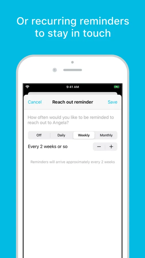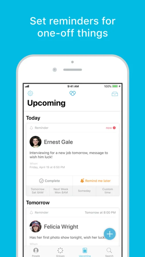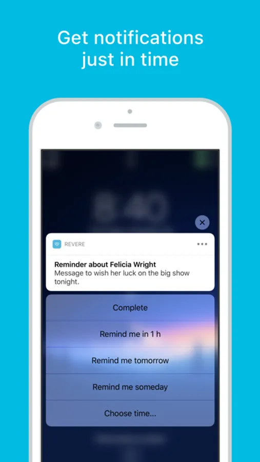 Revere also includes reminders (single and recurring) so you never forget to call back or stay in touch. Set them to call someone back, check in on a special day, or just to say hello. With Revere you'll have the peace of mind that a reminder will arrive when you need it. Never forget to reach out at an important moment again.