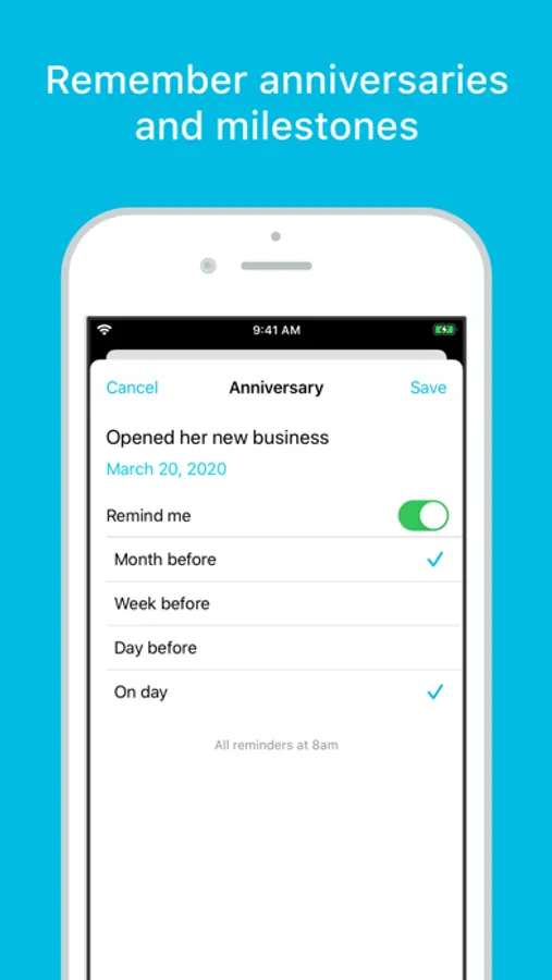 Revere is great for birthdays and holidays too. Make notes with gift ideas so when the birthday arrives, you’ll have the perfect one. And you can set *Birthday Pre-Reminders* for 1 day, 1 week, or 1 month early, so you don’t have to scramble or pay express shipping when buying a gift.