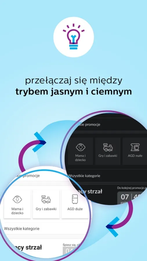 Ustaw tryb ciemny w aplikacji – zadbaj o wzrok i baterię. Włącz powiadomienia i bądź zawsze na bieżąco. Otrzymuj najświeższe informacje o nowościach, ekskluzywnych promocjach, Gorącym Strzale i statusie Twoich zamówień. Teraz masz pewność, że złapiesz każdą okazję.