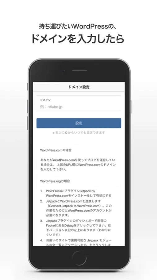 - WordPress.orgの場合は、Jetpackを入れるなどのWordPress側の設定が必要です(方法はアプリ内に記載)