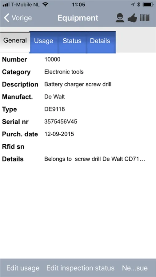 You can easily change the user so you can transfer the tool directly to a colleague. It is also possible to change the inspection status, provided you have the necessary rights. This means that the administration of your equipment is very efficient and you always have an up-to-date overview of the status of your equipment. This saves you time, so costs. The app works both online and offline and is, of course, optimally secured.