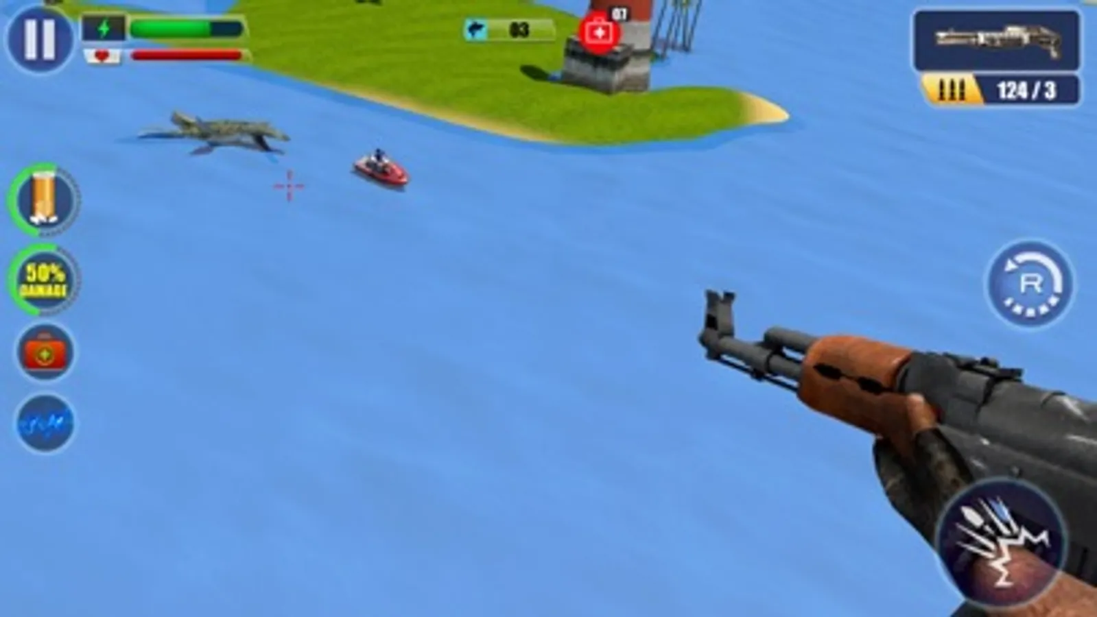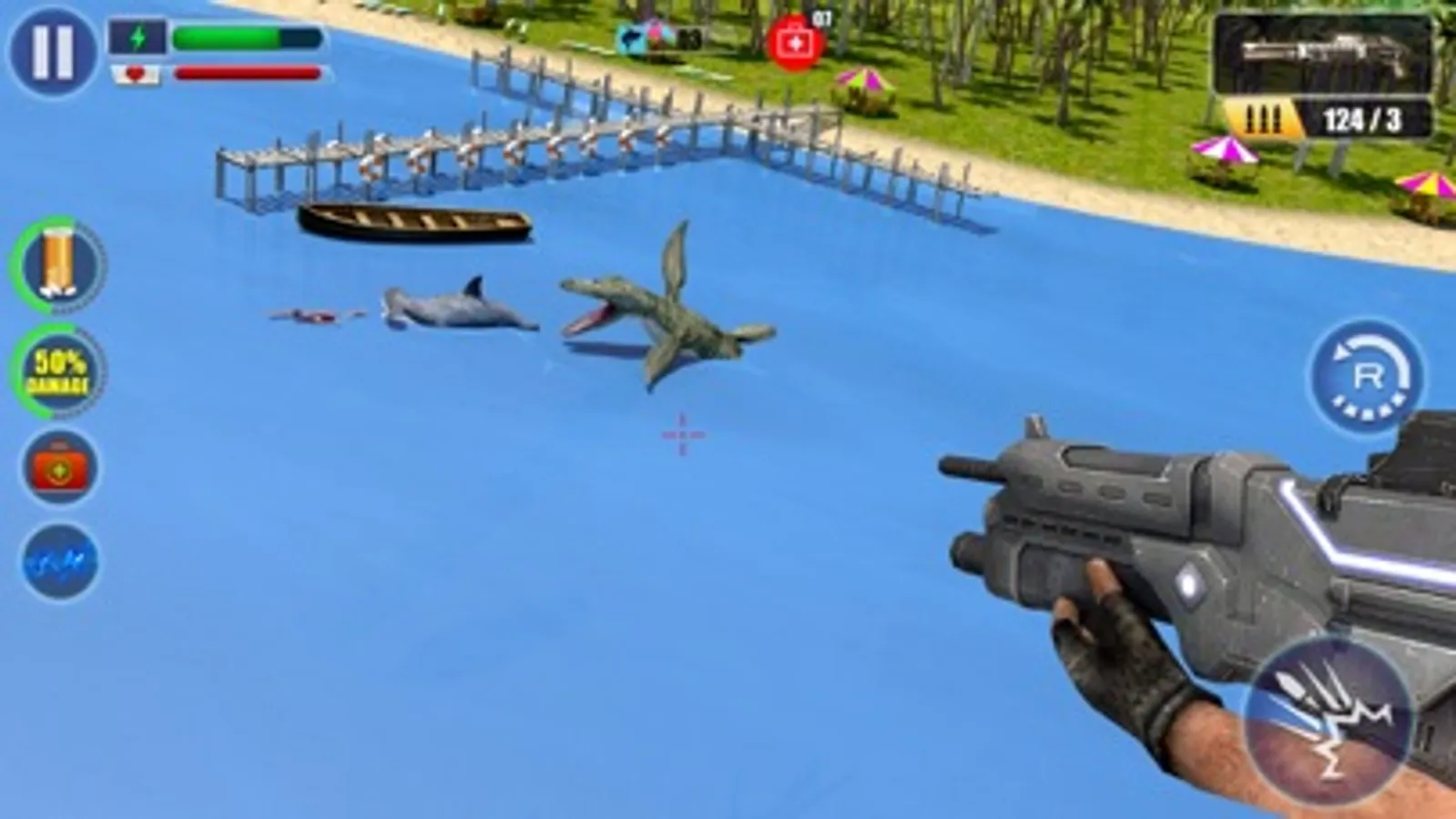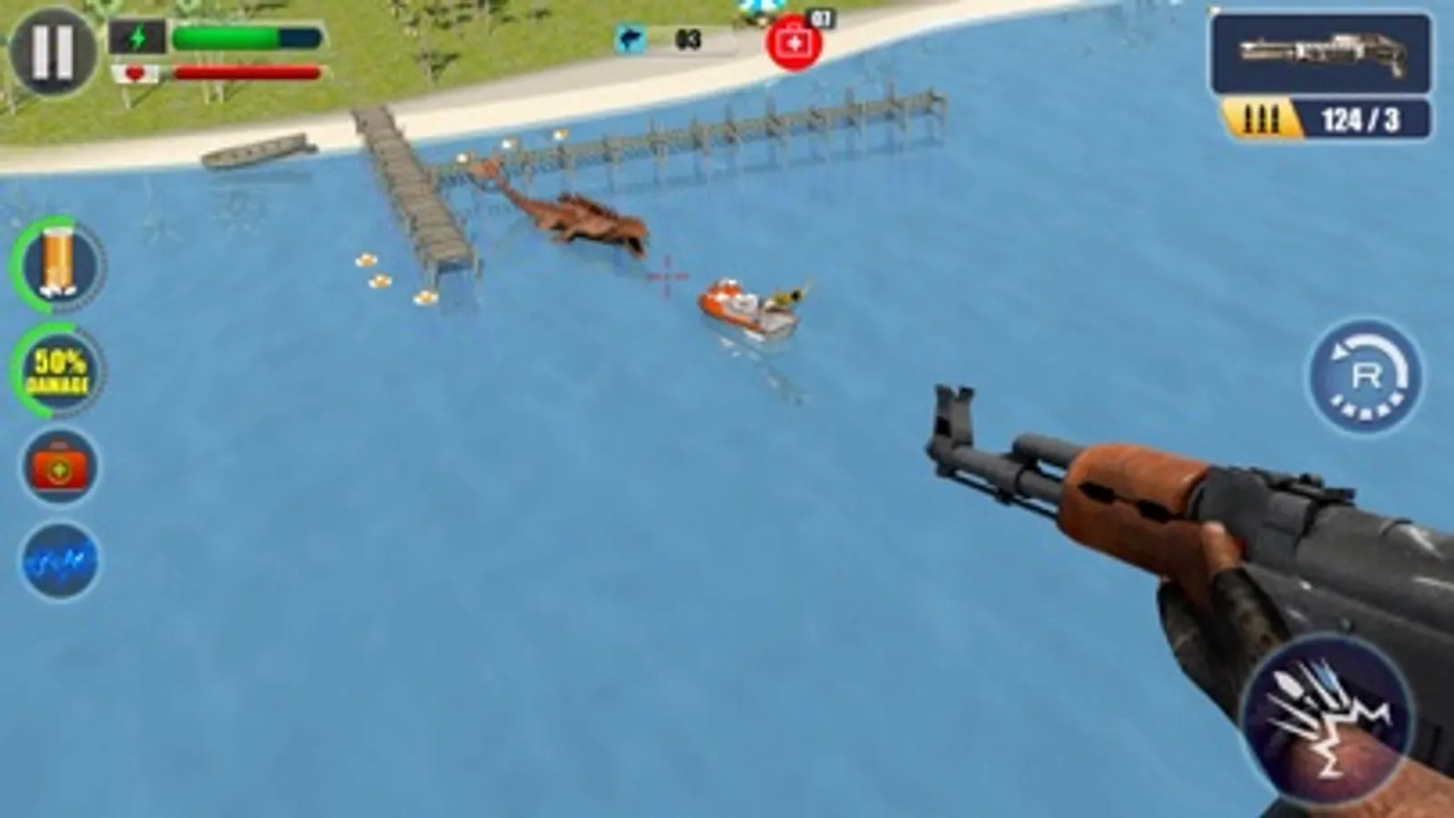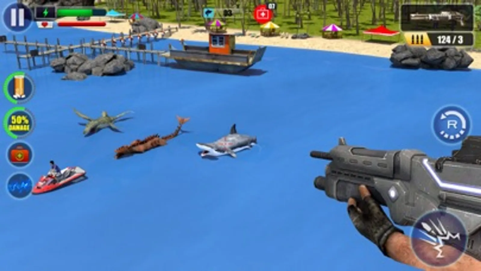 Hop on your jet ski and embark on a sniping adventure! You’re a sniper patrolling the ocean. Put your superior diving, swimming, and shooting skills to use! Choose from a variety of weapons like the AK-47, Mini-Gun, and Revolver. Use advanced weapons like the Beretta, UMP, and 9MM for instant kills and special high power bullets for a greater effect. Hunt down the beast that has been terrorizing pedestrians, lifeguards, and surfers. Aim, and SHOOT! Can you spot its menacing eyes and teeth from the surface?
