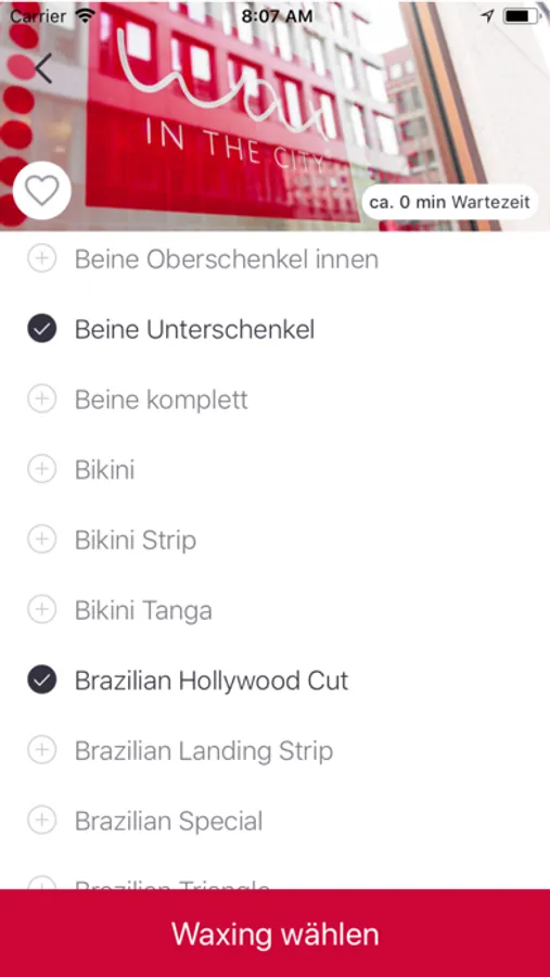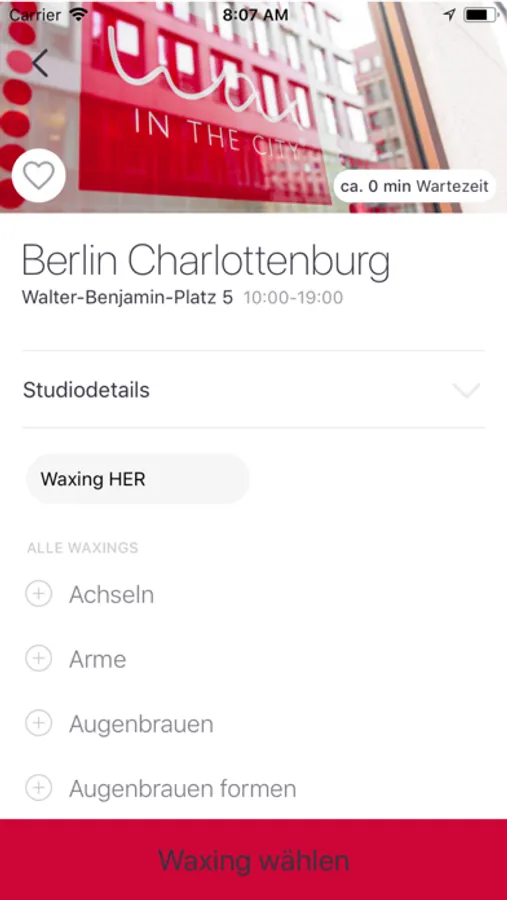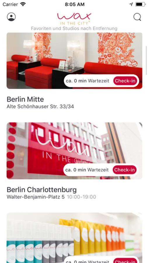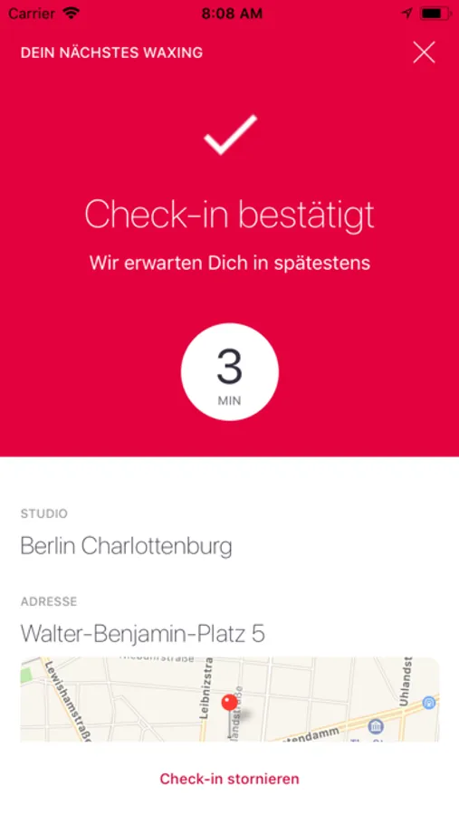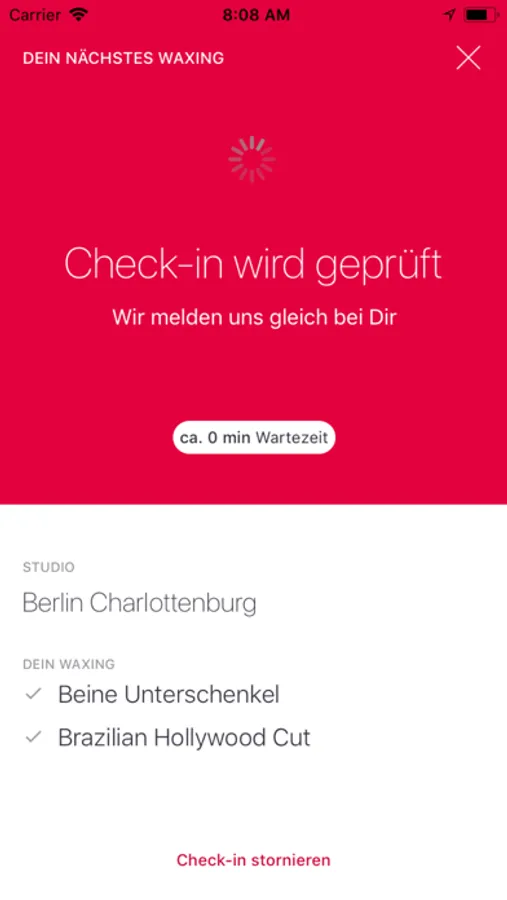 Once you have checked in via the app, a confirmation is sent to you promptly. We ask you to arrive at the studio within the given time. Your treatment will begin after minimum wait time. Since previous waxings may in some cases be shorter or longer than planned, the indicated wait times may vary. However, they are updated every minute.