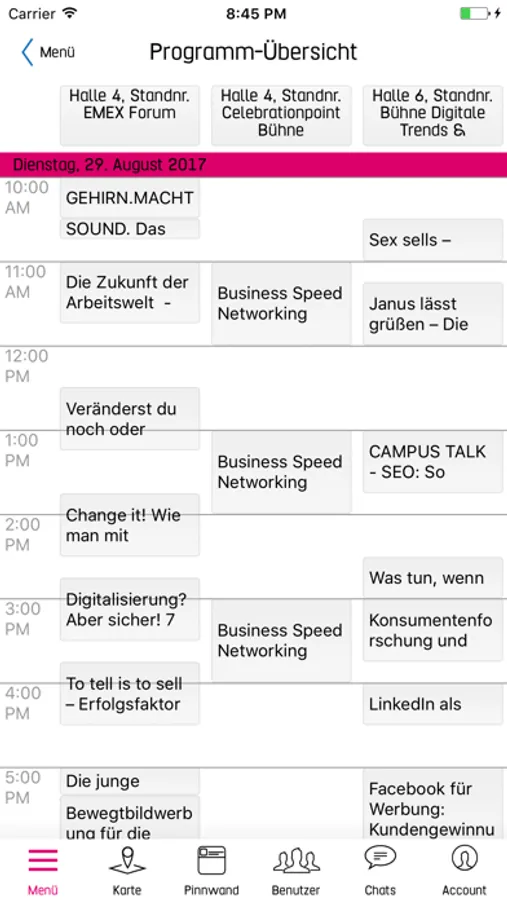 - Übersicht der Referate, Referenten und Events mit Details und Angabe der Location