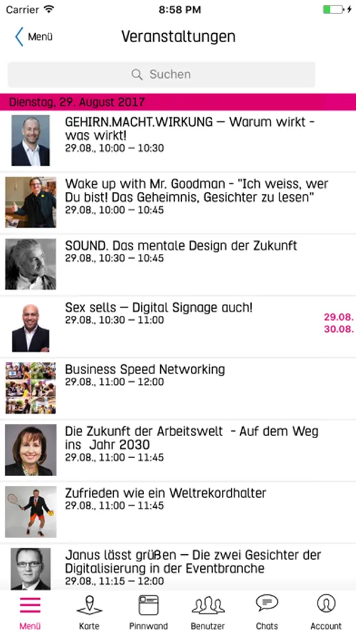 - Favoritenfunktion für interessante Events und Experten