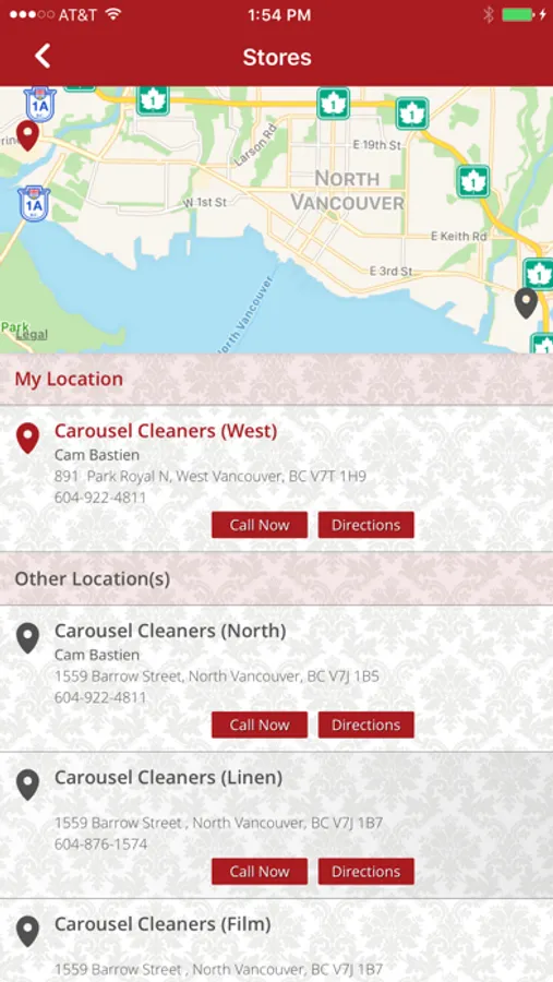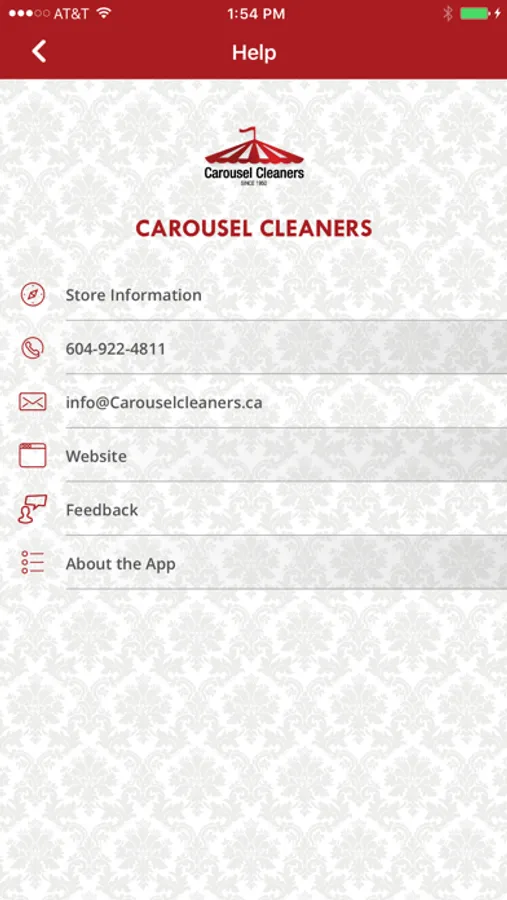 5) Quickly contact Carousel Cleaners by phone or email and access their website all directly from your device.