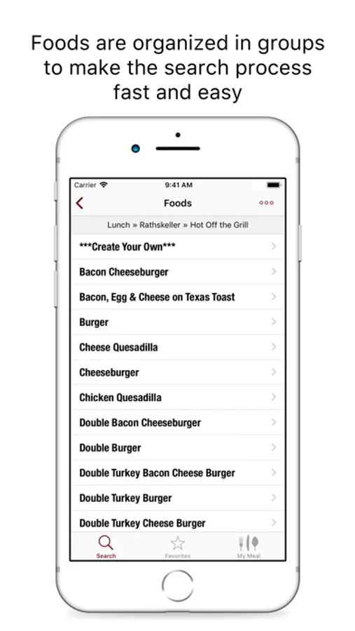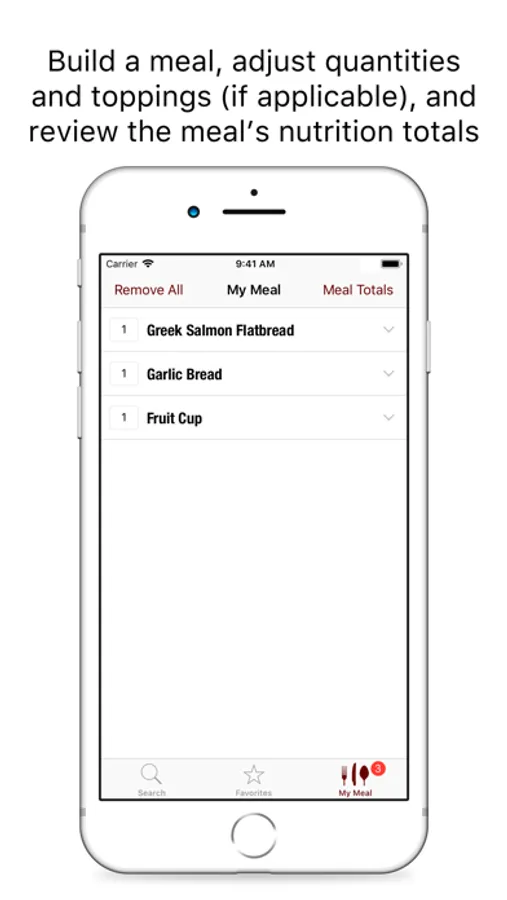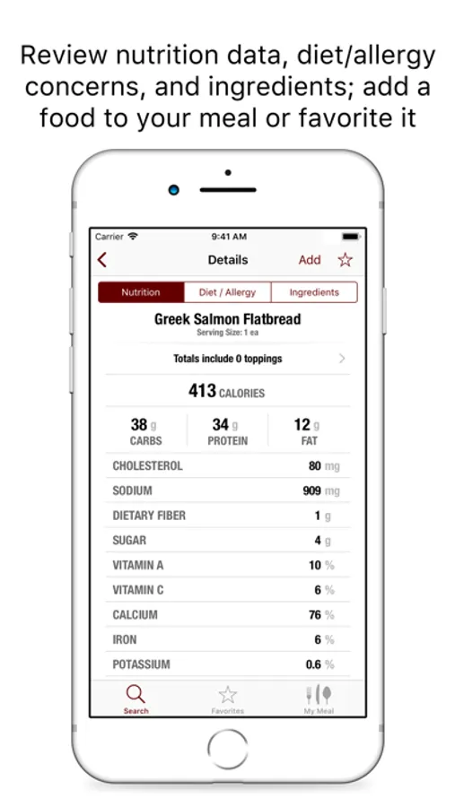 After configuring any toppings/condiments that may be available, add the food to your meal, and review your entire meal total to gain perspective on your dietary choices. And if you eat particular foods on a regular basis, favorite them to expedite future build-a-meal sessions.